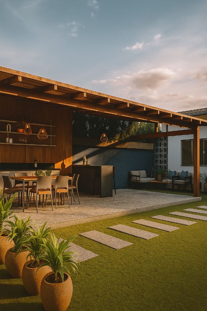 As soluções técnicas implementadas foram cruciais para garantir a funcionalidade, o melhor aproveitamento do espaço e a estética diferenciada do projeto, com foco na convivência ampliada e na otimização dos interiores. Para a área externa, foi criada uma Área Gourmet grande e totalmente equipada com churrasqueira e espaço suficiente para receber confortavelmente um grande número de pessoas e até mesmo bandas esporadicamente. Em um movimento de sustentabilidade e economia, a bancada da cozinha anterior da casa foi reutilizada e instalada na Área Gourmet, agregando história. A privacidade e ventilação foram solucionadas com a utilização intensa de cobogós no fechamento lateral, elevando o muro para bloquear a vista das construções vizinhas, mas garantindo a circulação de ar e o charme estético, conforme a estratégia de design que permite a visão desimpedida da mata apenas acima da vedação. Complementando a área de lazer, foi desenvolvido um lavabo externo com design conceitual e arrojado, que funciona como um ponto focal, e incluído um local de descanso dedicado na área de fora.