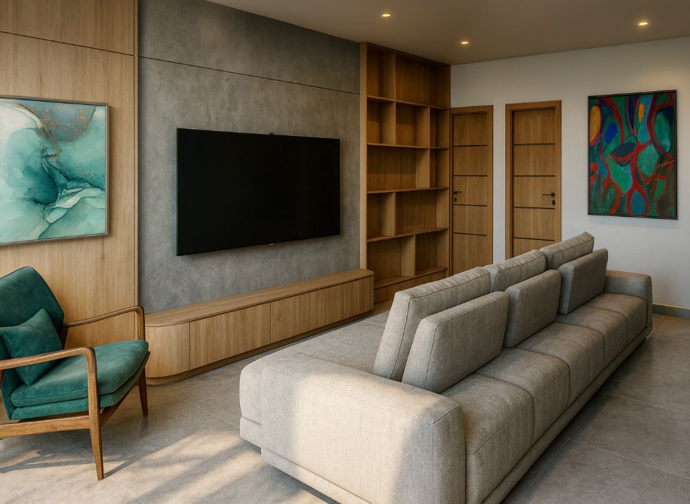 Na área social interna, a sala de estar foi projetada para ser verdadeiramente multifuncional com a implementação de um sofá ilha, que permite o uso bilateral, focado na TV ou voltado para integrar com a copa, garantindo máxima flexibilidade. Foi criado um mobiliário com forte personalidade, como o painel da TV e a cristaleira. O painel de TV, em particular, foi projetado especificamente para receber e emoldurar uma cadeira assinada em tom verde água, transformando a peça em um elemento de arte e funcionalidade que se encaixa perfeitamente ao conjunto. A cozinha foi ambiciosamente ampliada com a execução de uma bancada contínua e extralonga que ultrapassa os limites originais e invade a copa, expandindo a área de trabalho. Somado a isso, foi criado um móvel de cozinha embutido e planejado para assegurar o melhor aproveitamento do espaço. Por fim, nos quartos, o foco do design foi alterado para a intimidade e o aconchego, com a criação de móveis planejados individualizados para cada quarto, atendendo às necessidades funcionais específicas e à estética desejada.