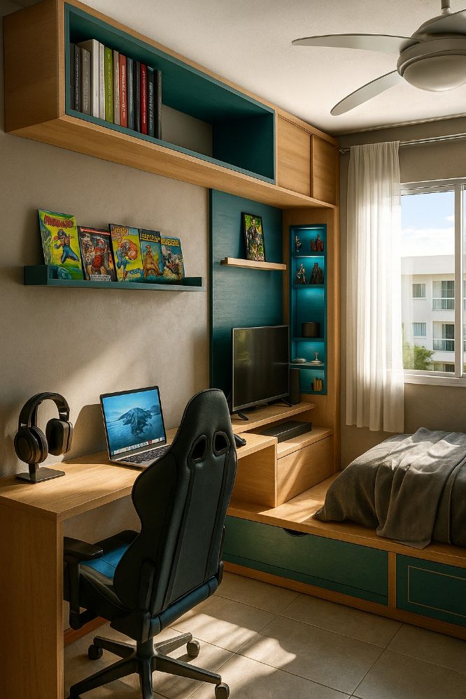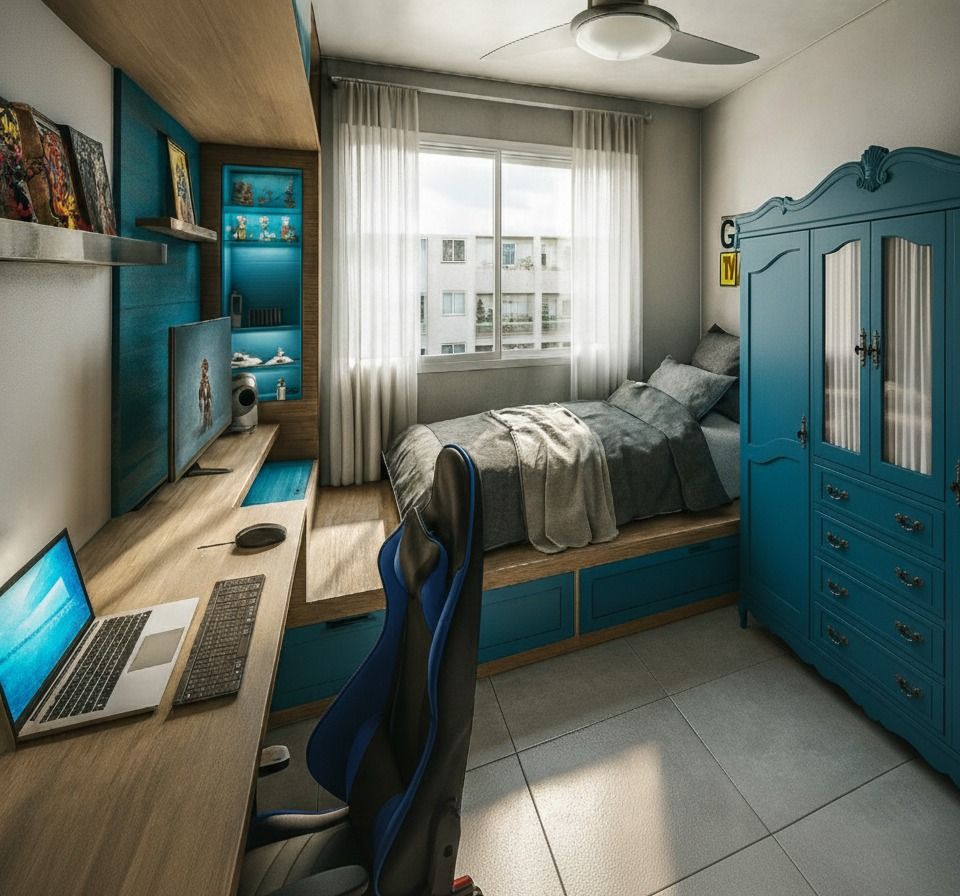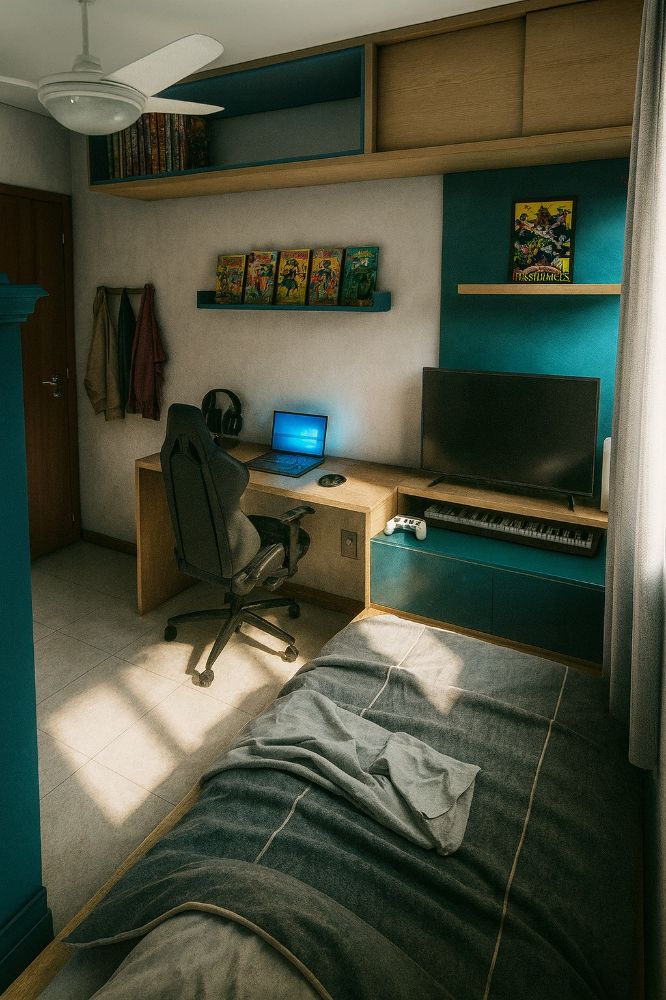 Este projeto de interiores nasceu da necessidade de transformar um quarto de metragem reduzida em um espaço altamente funcional e acolhedor para um pré-adolescente. O cliente, um jovem com múltiplos interesses, demandava a integração de diversas funções essenciais no mesmo ambiente: dormir, estudar, jogar videogame, usar o computador e tocar teclado, além da obrigação de manter o guarda-roupas antigo no local.