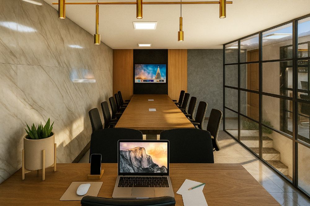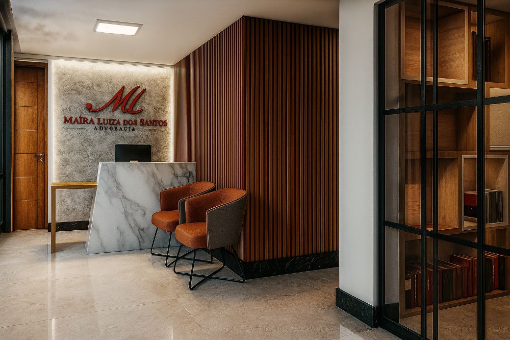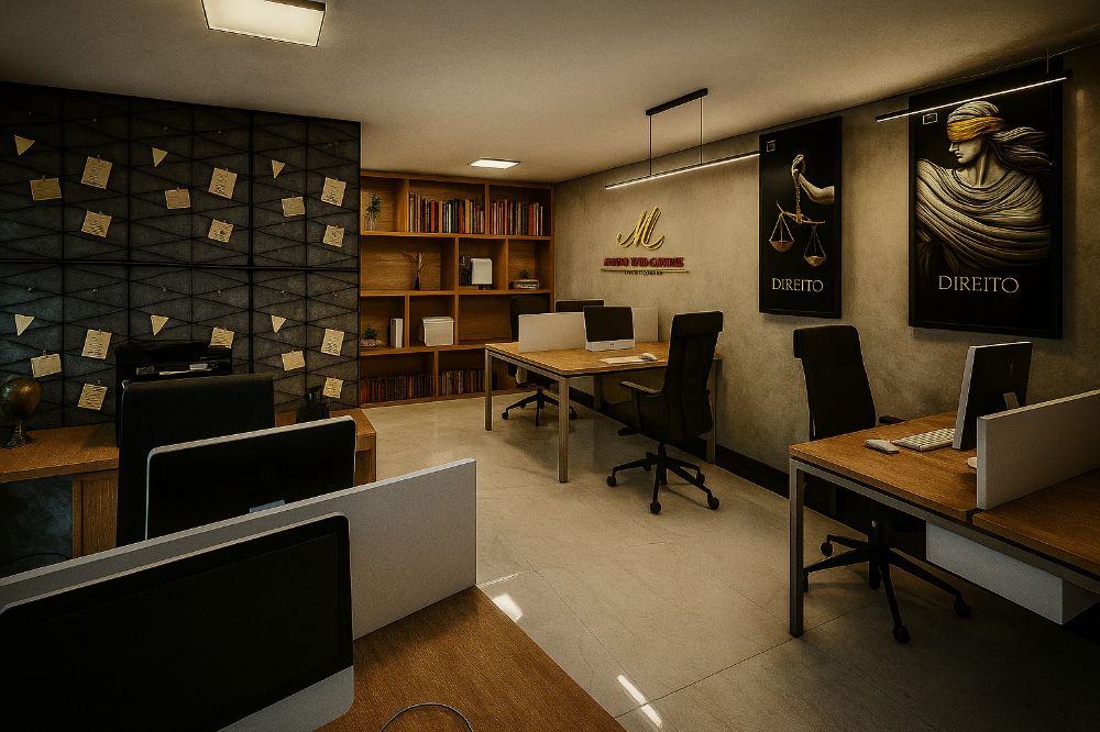 A proposta estética buscou transmitir seriedade, elegância e contemporaneidade, características inerentes a um ambiente jurídico. Optou-se por tons mais fechados, combinando madeira, pedra, ferro e iluminação em LED, elementos que reforçam a identidade corporativa e eliminam qualquer aspecto residencial presente na edificação original.