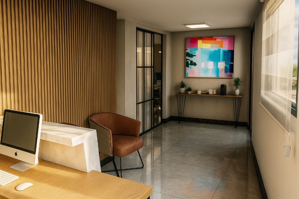 Cada mobiliário foi projetado sob medida, recepção, estantes, mesas de uso e mesa de reunião – garantindo melhor aproveitamento do espaço e integração visual. O projeto de interiores foi desenvolvido em conjunto com a cliente, que participou ativamente da escolha de materiais, acabamentos e objetos decorativos, incluindo quadros criados exclusivamente para o ambiente.